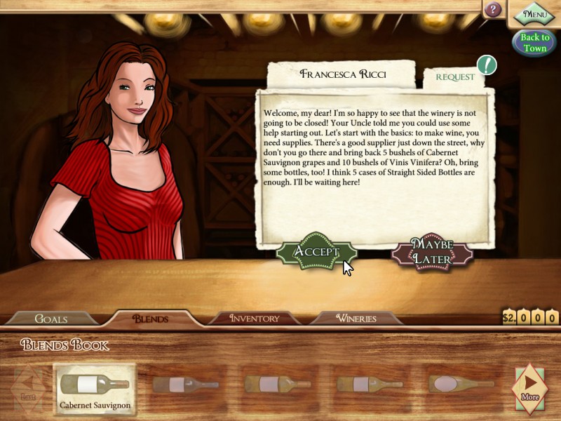 Travel the world collecting recipes and supplies to turn your small, rural family winery, into a successful, international winemaking enterprise. When Maria Bellaventura finds out that she has inherited an Italian winery, she must leave her stress-filled life as a corporate lawyer to take over the family business.